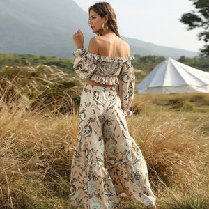 Description: long sleeve, frilled elastic smocking, high waist crop top, wide leg pants, two piece set, floral bohemian suit