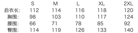 Size: S,M,L,XL,XXL ( From top to bottom: Back Length, Bust, Waist, Hip )