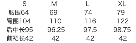 Size: S,M,L,XL ( From top to bottom: Waist, Hip, CB Length, CF Length )